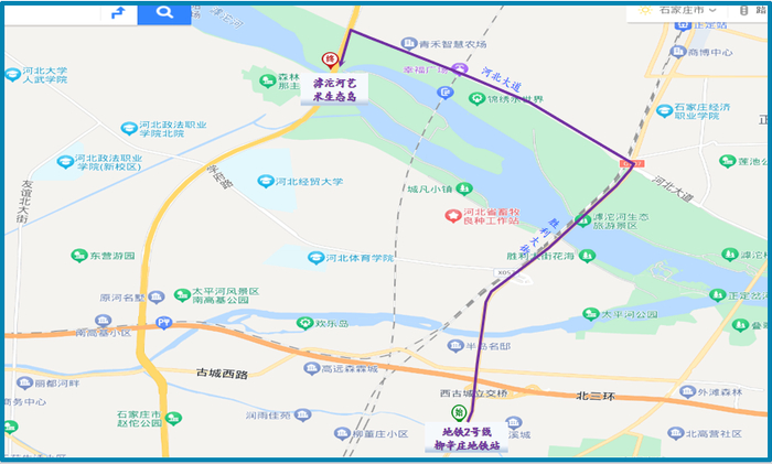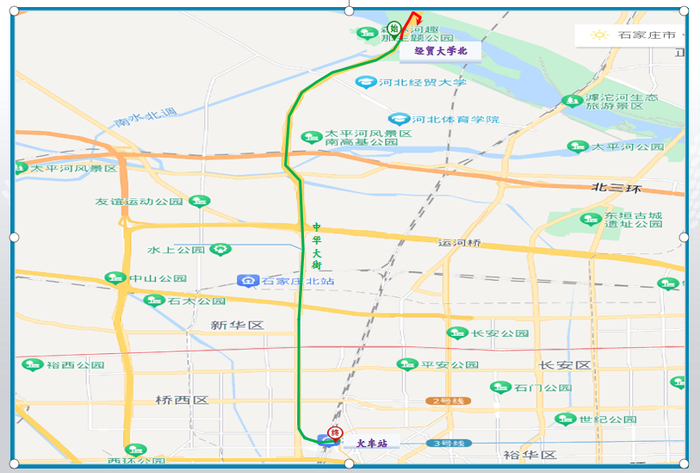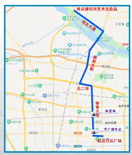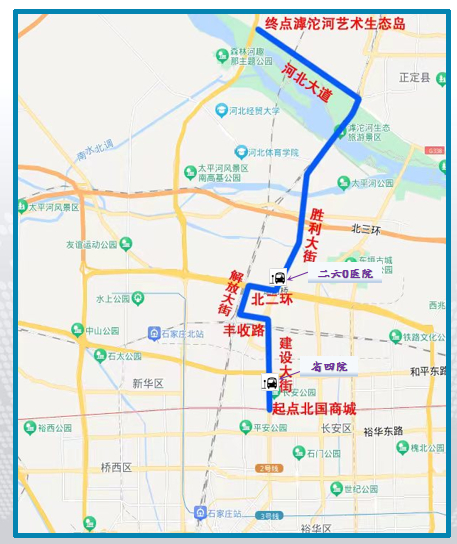 2、途经街道:槐安路、体育大街、北二环、胜利大街、河北大道至滹沱河艺术生态岛。