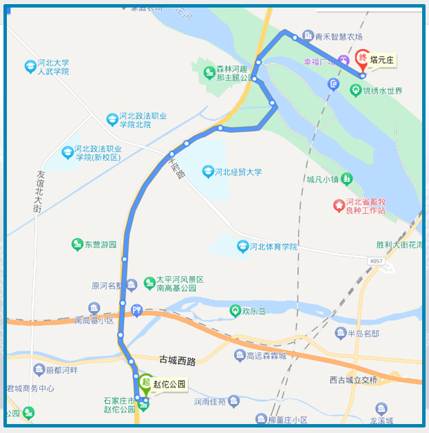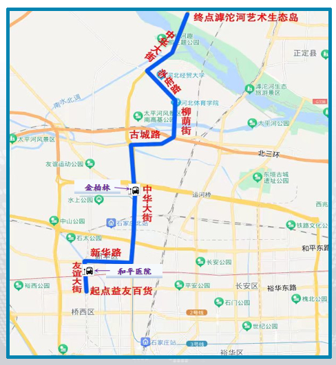 2、途经街道:友谊大街、新华路、中华大街、古城西路、柳荫街、学府路、中华大街至滹沱河艺术生态岛。