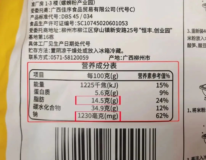 此外螺蛳粉还是高脂食物,100克螺蛳粉含脂肪14.5克,NRV%达到24%,小小的一包螺蛳粉的脂肪含量就有我们一天脂肪需求量的80%。