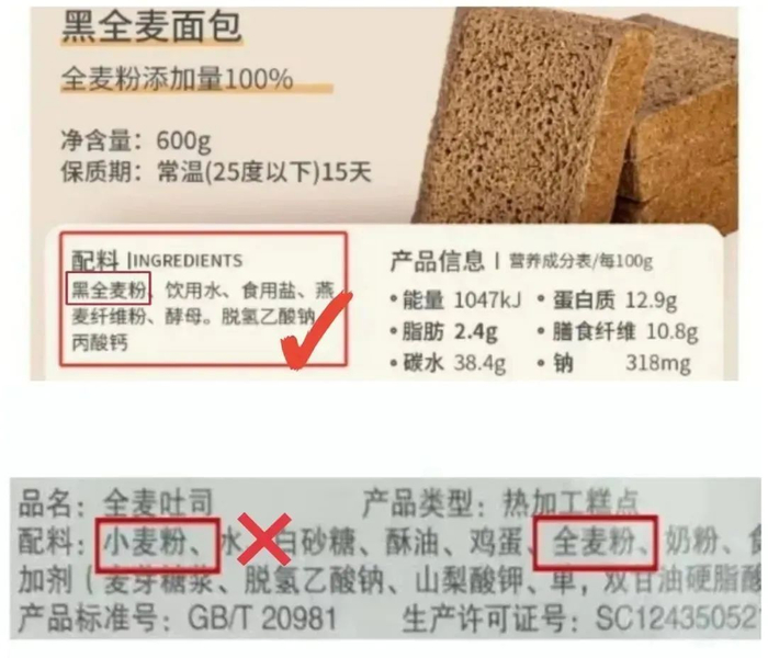 比如我们挑选全麦面包时,如果配料表中小麦粉在第一位,全麦粉在靠后的位置,这明显就不是“资格”的全麦面包。
