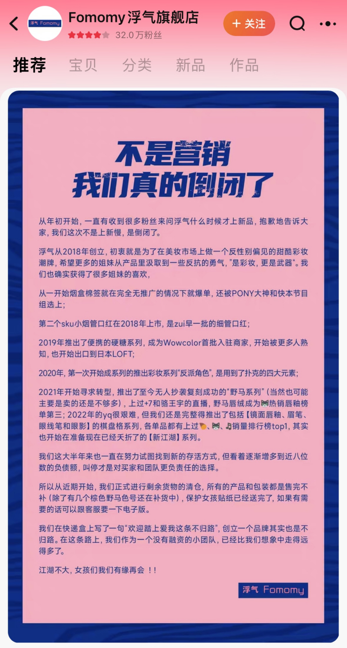 近日,知名彩妆品牌“浮气”在旗舰店发布公告称,“不是营销,我们真的倒闭了。”