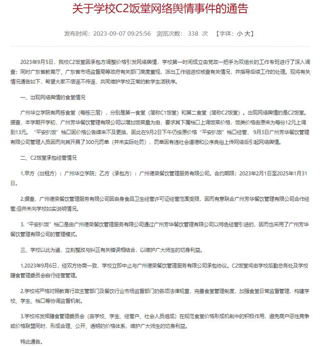 2023年9月5日,我校C2饭堂因承包方调整价格引发网络舆情,学校第一时间成立由党政一把手为双组长的工作专班进行了深入调查;同时广东省教育厅、广东省市场监督局等政府有关部门高度重视,派出工作组进校核查有关情况,并指导后续工作的处理。现将有关情况通告如下,希望大家不信谣不传谣,共同维护学校正常的教学生活秩序。