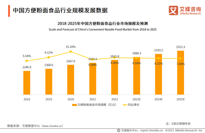 在消费模式增加、消费主体升级、国家对国民健康规划等驱动下,方便粉面食品行业正在往规范化、健康化方向发展。iiMedia Research(艾媒咨询)数据显示,2022年中国方便粉面市场规模为1823.8亿元,预计2025年达2312.3亿元。