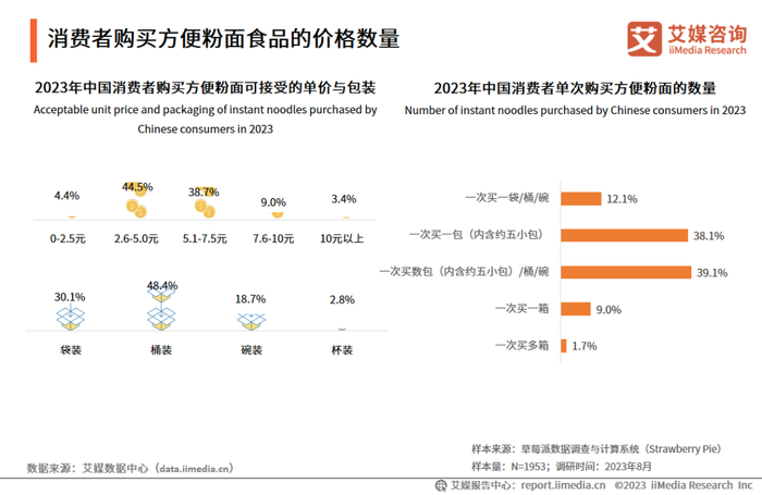 iiMedia Research(艾媒咨询)数据显示,2023年中国消费者购买方便粉面的可接受的单价多为2.6-5.0元(44.5%),其次是5.1-7.5元(38.7%);消费者倾向于单次购买数包(39.1%),也有部分消费者倾向单次购买一包(38.1%)。艾媒咨询分析师认为,目前,消费者对方便粉面可接受的单价仍然偏低,单次购买方便粉面食品的数量较高,对于消费者而言,平价方便面仍占主流,高端系列的方便面产品易将消费者“劝退”。如何改变消费者对方便粉面“便宜大碗”的价格认知,提升高端产品系列与客户黏性,是行业转型升级的关键。