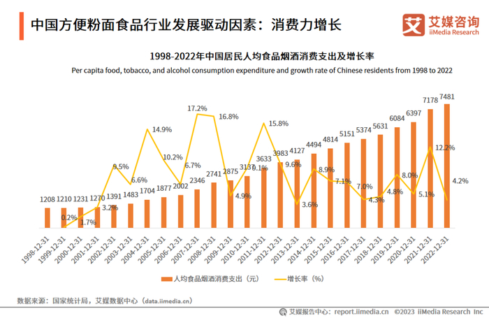 数据显示,从1998年至2022年,中国人均食品烟酒消费支出由1208元增长至7481元。艾媒咨询分析师认为,随着食品消费转型升级,方便粉面食品凭借快捷、便宜、美味等优点,受到学生党、年轻职场人等新消费群体的喜爱。