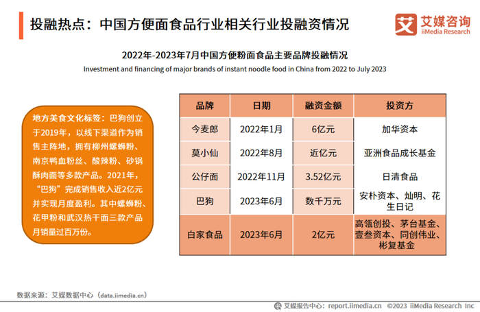 目前,多元化、中高端化、营养化、健康化非油炸方便粉面市场需求稳步增长,获得融资的方便粉面食品企业中,诸如“巴狗”“莫小仙”等新消费品牌占据半壁江山。艾媒咨询分析师认为,企业长期价值、未来增长空间以及是否能满足消费的多元化、差异化、地域化需求将成为资本关注重点。