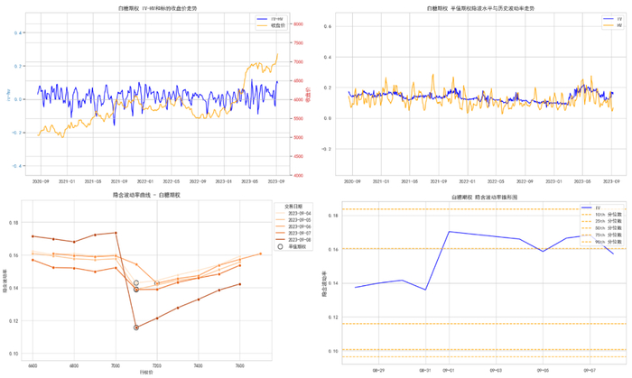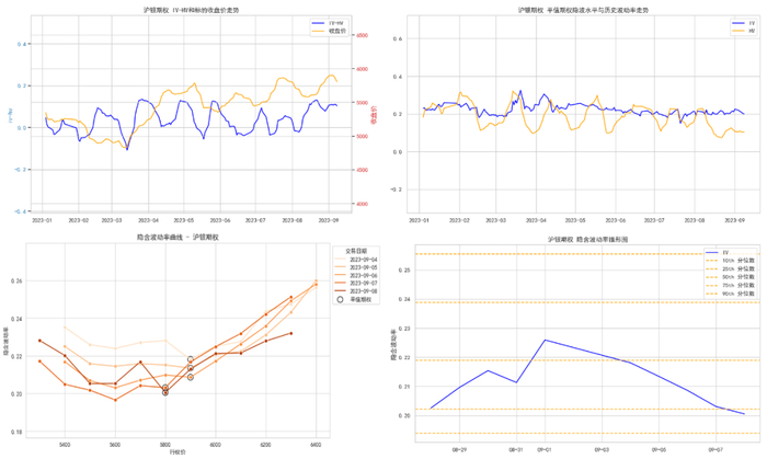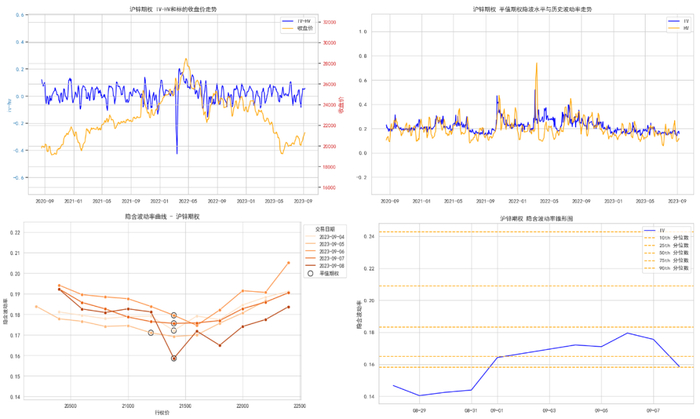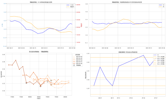 标的价格&平值期权价格指数:导致有色类期货价格波动不一,工业硅涨幅为:3.15%, 沪金涨幅为:0.83%。沪锌跌幅为:0.05%, 沪铜跌幅为:1.41%。平值期权价格指数方面,工业硅较上周有较大涨幅,涨幅为:251.06%。碳酸锂跌幅为:2.78%, 沪银较上周有较大跌幅,跌幅为:20.00%;