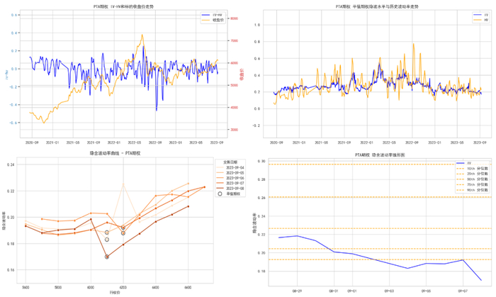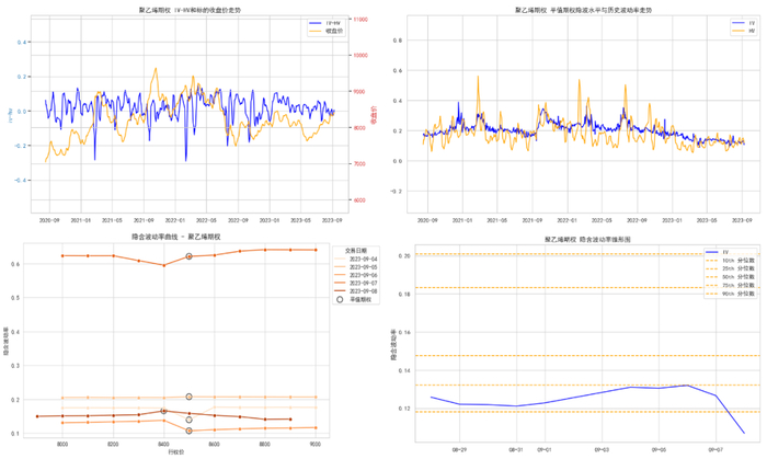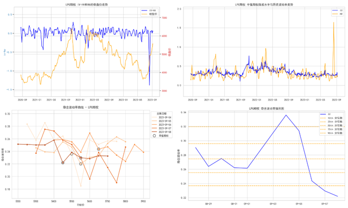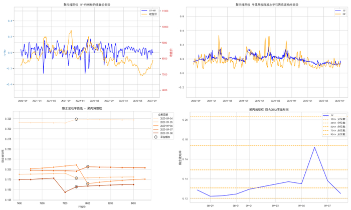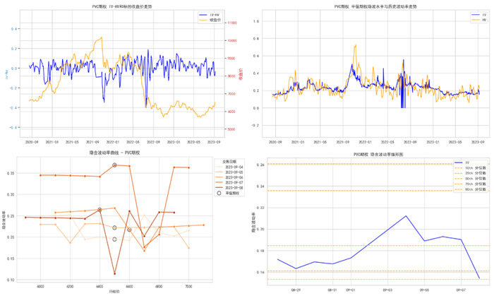 能化类商品期权:本周能化类商品期权各个品种主力合约隐含波动率,大多处于较低历史区间。PTA期权隐含波动率历史分位数为1%,聚乙烯期权隐含波动率历史分位数为2%, LPG期权隐含波动率历史分位数为4%,聚丙烯期权隐含波动率历史分位数为18%,PVC期权隐含波动率历史分位数为12%,原油期权隐含波动率历史分位数为13%,苯乙烯期权隐含波动率历史分位数为22%,处于较低历史区间。根据波动率均值回归角度判断,可以关注隐含波动率后续向历史均值的回归。