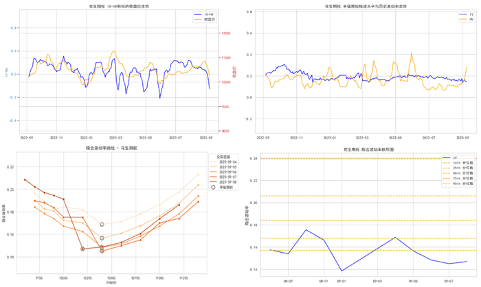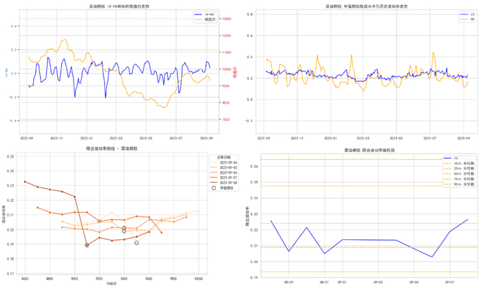 波动率指标方面:本周多数品种隐含波动率水平都在震荡回落处于历史较低水平。大多数品种的本周的隐含波动率水平都处于历史50分位以下,从隐含波动率均值回归角度分析,可以重点关注处于历史较低分位的品种及处于历史较高分位的品种。
