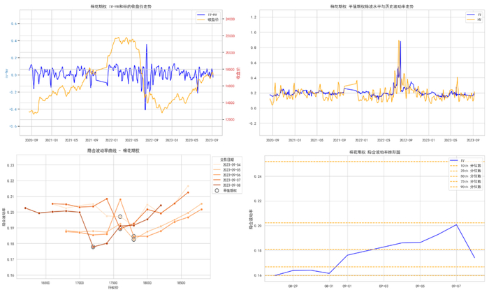 农产品&软商品类商品期权:本周农产品&软商品类商品期权各个品种主力合约隐含波动率,除白糖期权和豆2期权外,大多处于较低历史区间,其中棕榈油期权和豆油期权创历史新低。豆油期权隐含波动率历史分位数为0%,棕桐油期权隐含波动率历史分位数为0%,花生期权隐含波动率历史分位数为2%,豆粕期权隐含波动率历史分位数为6%,豆1期权隐含波动率历史分位数为8%,玉米期权隐含波动率历史分位数为39%,菜粕期权隐含波动率历史分位数为35%,棉花期权隐含波动率历史分位数为39%,处于较低历史区间;豆2期权隐含波动率历史分位数为77%,白糖期权隐含波动率历史分位数为70%,处于较高历史区间。根据波动率均值回归角度判断,可以关注隐含波动率后续向历史均值的回归。