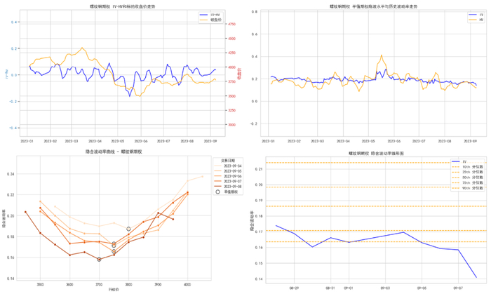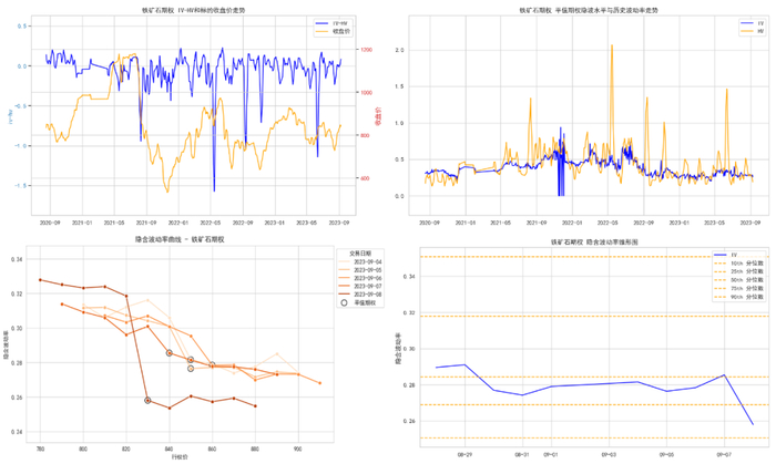 标的价格&平值期权价格指数:导致各品种黑色类期货本周价格跌幅不一,。螺纹钢跌幅为:2.70%, 铁矿石较上周有较大跌幅,跌幅为:8.36%。平值期权价格指数方面,铁矿石较上周有较大涨幅,涨幅为:405.49%。螺纹钢较上周有较大跌幅,跌幅为:30.56%;