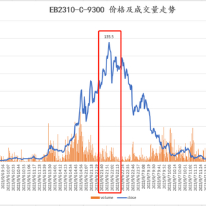 为何期权价格会在很短的时间向上突破这么多呢?因为短时间期货价格突破了9300这个点位,导致EB2310-C-9300这张合约一度由虚值合约转变成实值合约。而随后的这张期权价格迅速回落也是因为期货价格的回调导致合约又从实值合约变成了虚值合约。