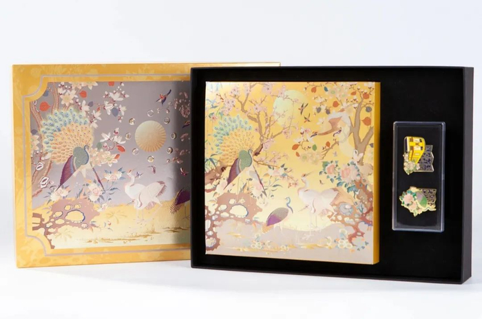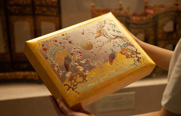 礼盒以广东省博物馆经典藏品“黑缎地广绣花鸟挂屏”为主要题材,巧妙利用了文物极具装饰性的特点,华美配色与细腻纹理搭配,外包装配以烫金、激凸等工艺,造就丰富细腻的层次。