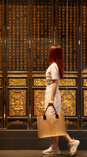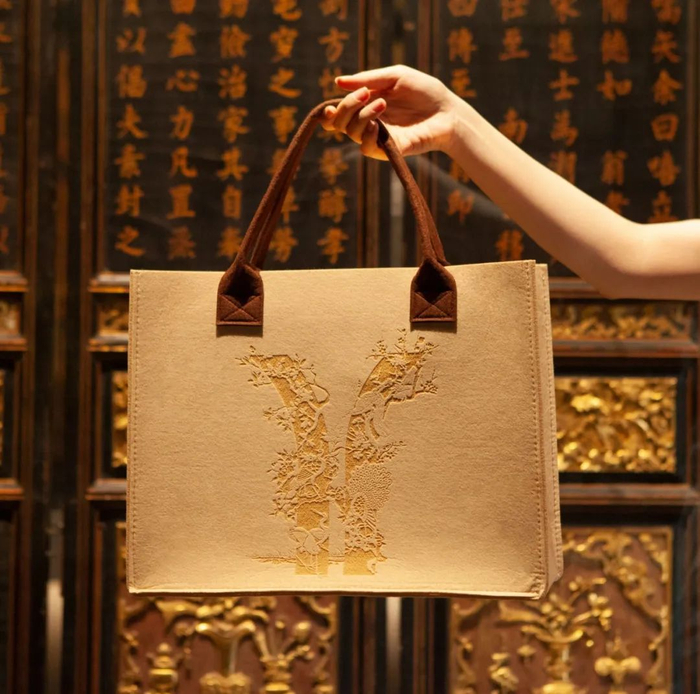 本次中秋礼盒更配有限定版毛毡袋,通过镭射工艺,将羊角Logo与黑缎地广绣花鸟挂屏上的图案做了创意结合,既高雅大气又不失时尚之感。