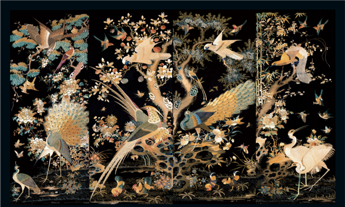 《黑缎地广绣花鸟挂屏》,四屏皆以黑缎为地,施五色丝线,将世间祥禽定格屏上。蝶燕双双,结伴而飞;孔雀开屏,鹌鹑顾盼;雄鸡觅食,白鹤行走;玉兰鹦鹉,寿石雉鸡;仪态万方,春色满园。四屏色彩明亮,富丽堂皇,针脚平齐,轮廓工整,装饰效果极佳。