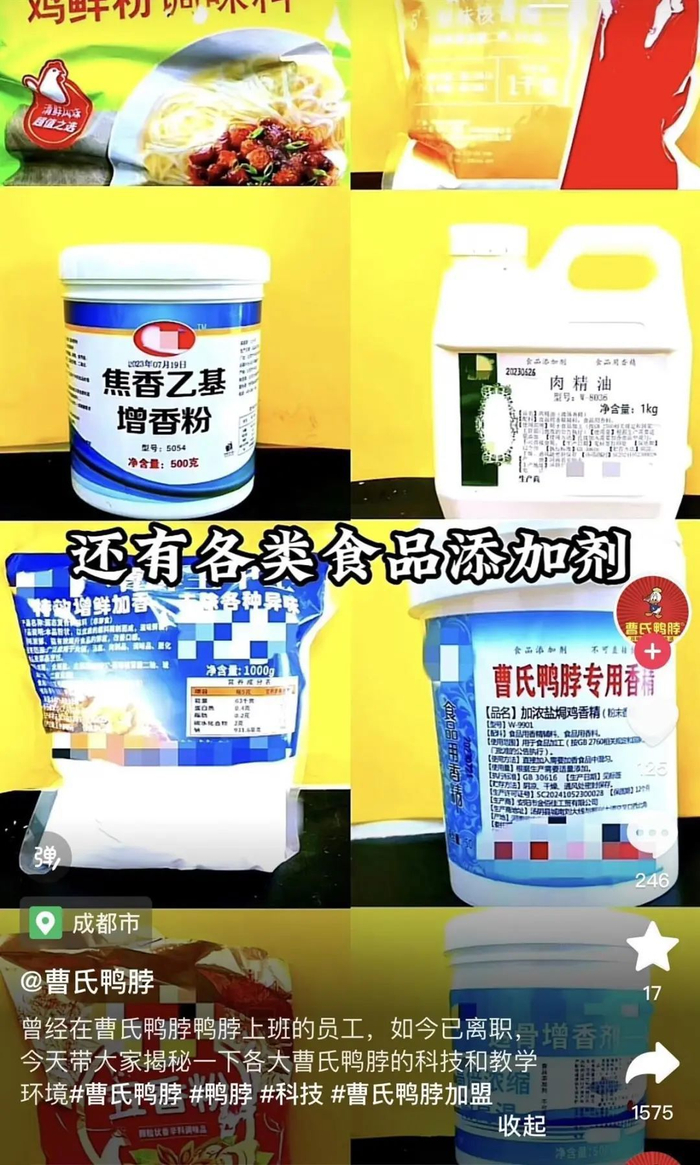 近日,“曹氏鸭脖”的企业认证号曝光了自家汤料的配方,里面含辣汤香精、油溶性辣椒精等十多种添加剂,并以前员工的口吻称这是蜀湘曹氏鸭脖公司的配料。9月7日,蜀湘曹氏鸭脖所属公司就此事回应称,该账号和“前员工”与公司无关,是有人恶意诋毁。辖区市监局回应称,他们会记录并了解此事。“曹氏鸭脖”企业号自曝加多种添加剂近日,一个名叫“曹氏鸭脖”的企业认证号发视频称,“我之前在曹氏鸭脖工作了一段时间,现在辞职了,给大家揭秘一下蜀湘曹氏鸭脖的黑科技,全是科技与狠活。”视频中曝光了汤料的配方,里面有十多种添加剂,像辣汤香精、辣椒红、油溶性辣椒精等都在其中,并注明了添加比例和使用方法。