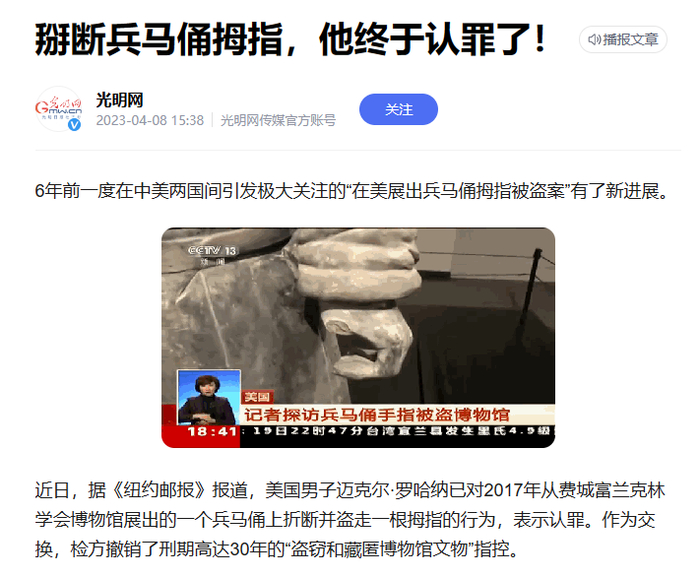 2017年,在美国费城的富兰克林科学博物馆,一名男子醉酒后,掰断了从中国租借的兵马俑的一枚大拇指,并将其偷走。