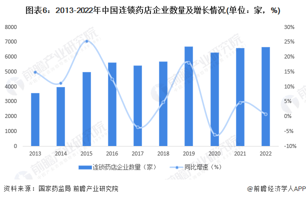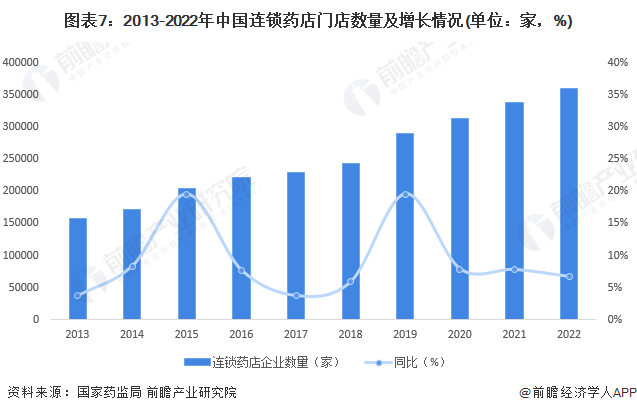 2013年以来中国连锁药店门店数量呈逐年递增趋势,增速波动变化。截至2022年年底,中国连锁药店门店数量达到36万家,同比增长6.7%。