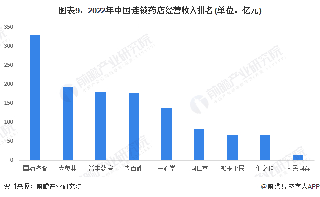 2022年,中国连锁药店上市公司中,国药控股药品零售规模最高,达到330亿元,大参林、益丰药房、老百姓三家连锁药店零售收入均超过150亿元,排名领先。