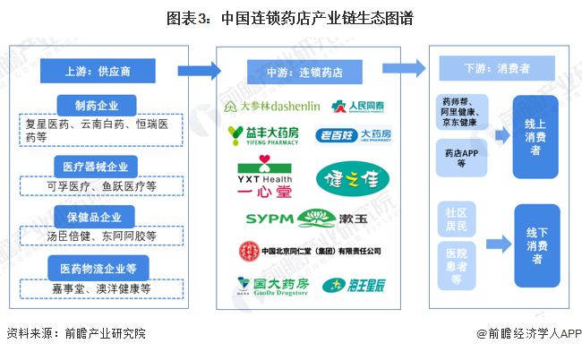 连锁药店产业链上游主要为制造企业、医疗器械生产企业、保健品生产企业以及医药物流供应商等;中游为连锁药店;连锁药店下游主要为线下客户和线上客户,线上客户通过医药电商平台、药店APP等需求获得。