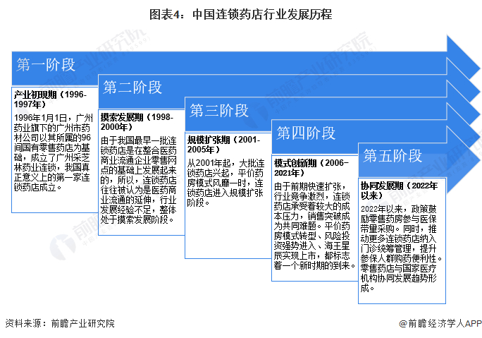 从1996年至今,我国连锁药店行业主要经历了以下五个发展阶段:产业初现期、探索发展期、规模扩张期、模式创新期以及协同发展期。