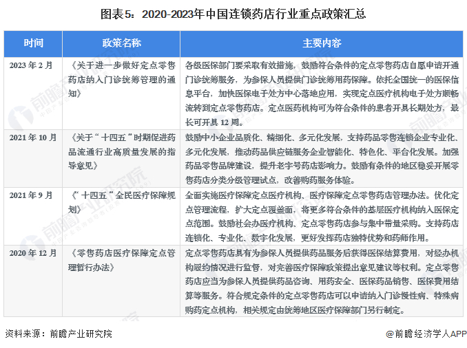 近年来,国家完善药品流通环节,颁布多项政策鼓励药店连锁化经营、参与医保带量采购,推动药店纳入门诊统筹。2020-2023年中国连锁药店行业重点政策汇总解读如下: