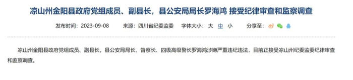 凉山州金阳县政府党组成员、副县长,县公安局局长、督察长、四级高级警长罗海鸿涉嫌严重违纪违法,目前正接受凉山州纪委监委纪律审查和监察调查。