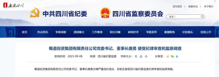 9月1日,四川省委决定,蜀道集团党委书记、董事长唐勇同志停职检查,配合调查。同时,成立省政府进驻蜀道集团工作组,开展相关督导工作。