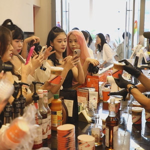 母山咖啡“Biang香拿铁”新品吸引不少市民、美食探店博主到现场品尝打卡。记者 郑光平 摄
