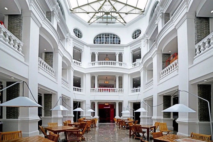 内部空间上,北京坊没有局限于绝对的保留和绝对的创新,有限的地域里,建筑特色凸显出来,既可以看到百年历史的巴洛克风格劝业场,也能看到当代建筑美学与传统四合院巧妙融合的建筑元素。古色古香的木制架构与落地透光玻璃,青砖地面与西式连廊,兼容并包,形成北京坊独有的文化传播方式。
