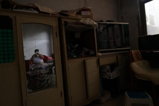 屋里发霉的墙角、脱落的墙皮露出里面的砖。她窝在这里,屋内的一切陈设都跟她走过了大半生的时光:布制的沙发已经塌陷,木架勉强撑起了它原有的形状;旁边七扭八歪的木柜上摆满了各种药罐;一米多高的衣柜没有了门,上面的镜子已然生满了锈,照不清人的样貌;一台大头电视许久不开,梁建红偶尔会插上电源试试坏了没有;她结婚时买的风扇历时40多年如今依旧吱呀着,还有一个木质的摆钟,如今还是分秒不差……