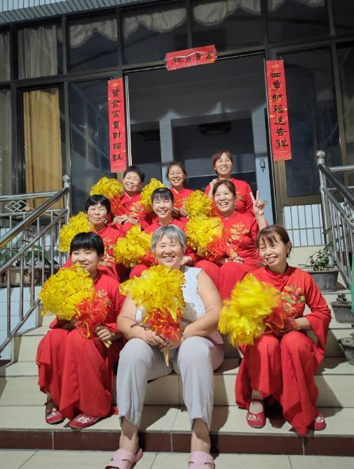 晚饭后,女人们换好舞蹈服三三两两地出现在梁建红院子里。她跳不了,就搬个板凳坐在前面给她们放音乐、拍照。音乐声响起,十来把鲜艳的红扇子随着音乐挥舞,梁建红坐在前面,她身旁坐着几个比她年岁小很多的邻居,各自含饴弄孙。梁建红时不时看一眼,又赶快移走视线,跟着舞蹈摆动双手……