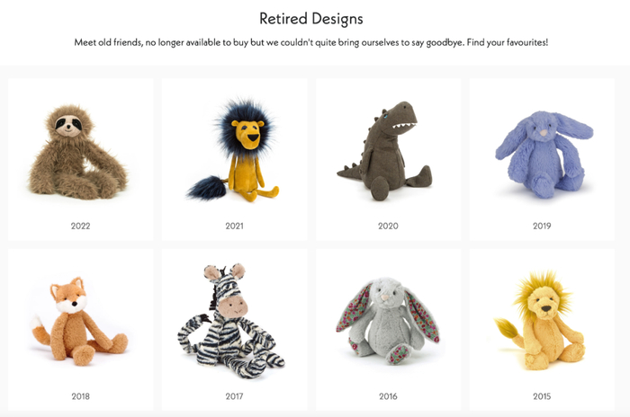 从2010年开始,jELLYCAT每年都会在官网上公示一批即将下架、停产的玩偶,数量高达上百款,这则公告叫做“retired designs”,也可直译为“退休名单”。每当此时,全网唉声一片,那是一种失去朋友的失落感。