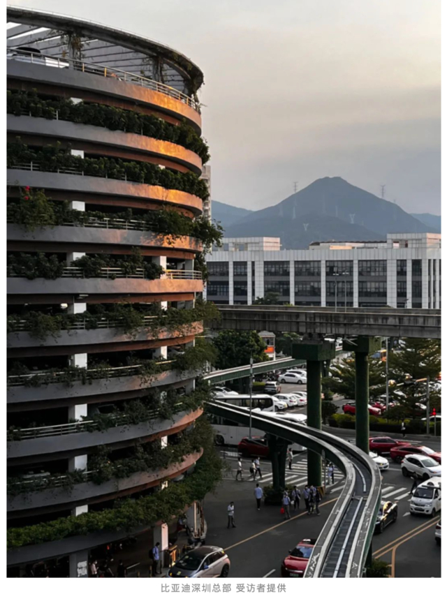 2007年建成的六角大楼,成了比亚迪深圳总部的代表建筑。这座大楼承载着这家公司最引以为傲的技术,接待用的礼宾楼有着漂亮的玻璃外立面、高科技的展示橱窗和贴满专利的高墙。然而穿过现代化的礼宾楼,六角大楼的其他部分都显得老旧,除了颗粒感十足的水泥路,连灯光都泛着昏暗的白色。让小乐“一步穿越回十几年前”。