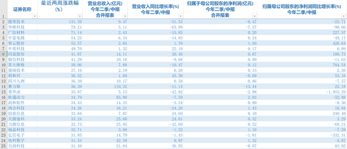 截至目前,过去两周(8月28日至9月8日)10个交易日内,捷荣技术已整体上涨了131.39%,位列所有华为概念股区间涨幅第一,另外,华映科技、广信材料、中富电路、智云股份、中英科技、同益股份、银信科技区间涨幅分别高达79.21%、71.14%、54.25%、52.57%、49.70%、41.87%、41.29%。