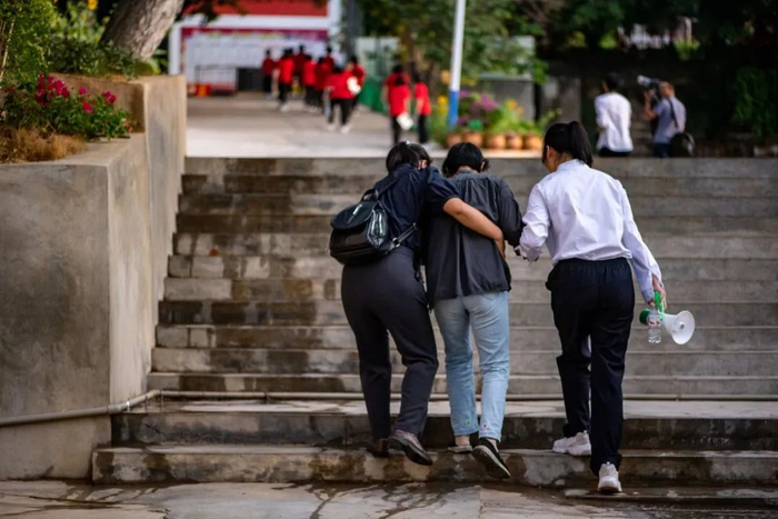直到最后一个学生进了考场,张桂梅才坐下来喘口气。
