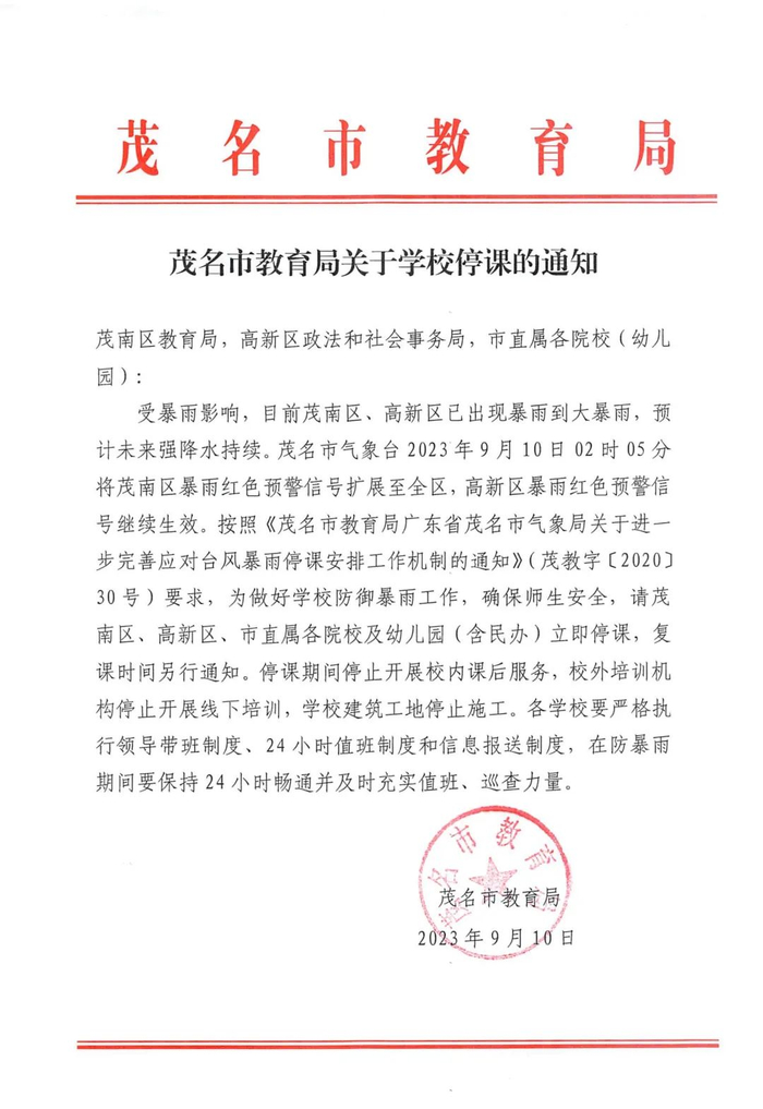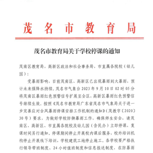 茂名市教育局发布通知,为做好学校防御暴雨工作,茂南区、高新区、市直属各院校及幼儿园(含民办)立即停课,复课时间另行通知。