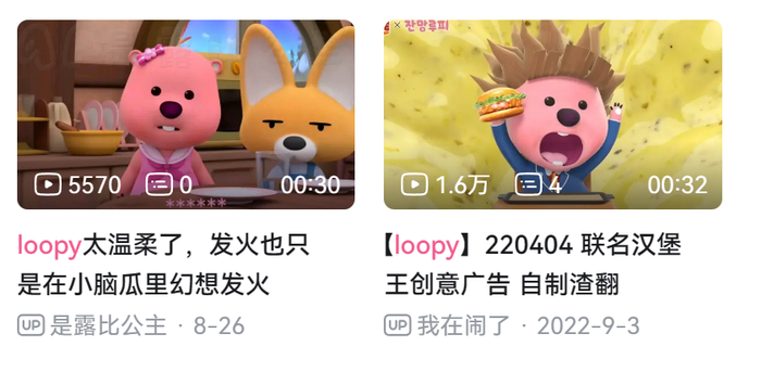 在视频平台上搜索loopy,能搜到许多一两年前、loopy形象刚传进国内时的内容,大多是常规动画片段、播放量不高。