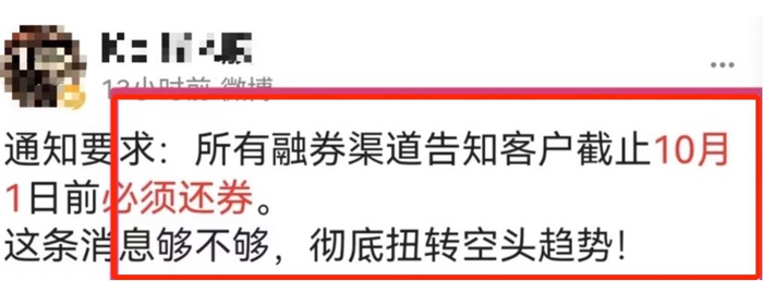融券作为A股可“做空”的力量,终止融券出借,杂糅在当前市场震荡磨底、高频量化被质疑的情绪中,挑动了市场的敏感神经。立马传出小作文称已有通知“所有融券渠道告知客户截止10月1日前必须还券”,在社交平台被迅速讨论。