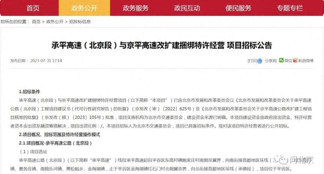 随后,记者也在北京市交通委官网上查询到了王先生所说的“承平高速(北京段)与京平高速改扩建捆绑特许经营项目”的招标公告。记者为此联系北京市交通委核实情况,相关工作人员解释说: