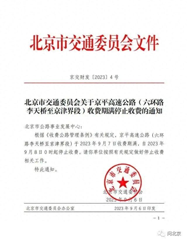12328:咱们根据收费公路管理条例有关规定,京平高速六环路李天桥至京津界段于2023年9月7日收费期满,自2023年9月8日零时起停止收费。