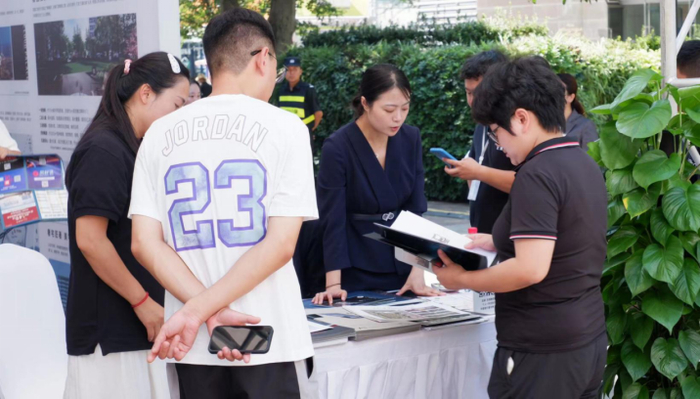 2023秋交会首日,龙湖地产展台人头攒动,不少购房者前来咨询房源信息。