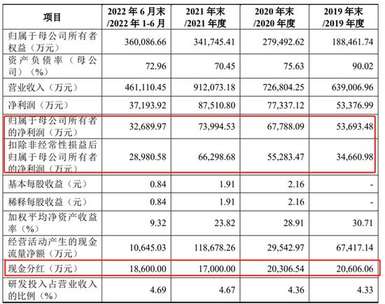 招股书显示,2019-2021年及2022年上半年(下称“报告期”),人本股份的营业收入分别为63.9亿元、72.68亿元、91.2亿元、46.11亿元,净利分别为5.34亿元、7.73亿元、8.75亿元、3.72亿元,业绩相对稳定。