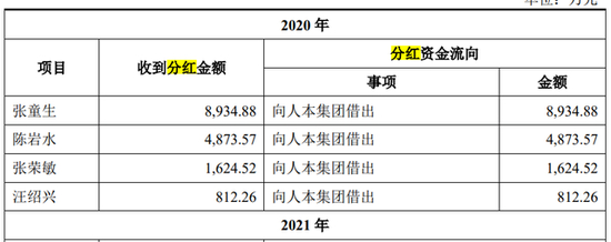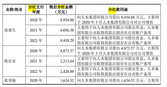 以张童生为例,2020年至2022年,分红金额分别为8934万、4056万、4438万,累计分红1.74亿,而这些分红资金又出借给了人本集团。陈岩水、张荣敏等股东的分红资金也出借给了人本集团。