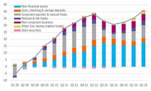 房地产是另一大推动因素。由于待售房屋供应不足抵消了抵押贷款利率飙升导致的需求下降,二季度,美国房地产价值自2022年第二季度以来首次上涨,为资产净值增长贡献了2.5万亿美元。