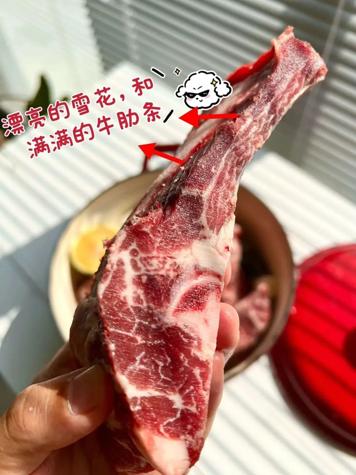 瞧瞧这天然的肉质肌理,和丰富的雪花纹,饱满的肋排牛肉,光看都知道是正儿八经好牛排!