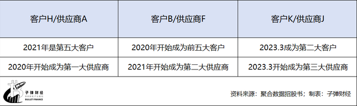 「子弹财经」梳理发现,聚合数据的三位客户H、B、K同时是企业的供应商,分别对应供应商A、供应商F、供应商J。