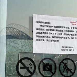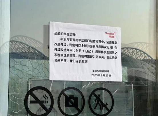 无独有偶的是,就在郑州华润万家秦岭路店关闭的同一天,沈阳浑南亿丰时代广场的华润万家超市也张贴出通知:华润万家浑南中店即日起暂停营业,全面开启改造升级。