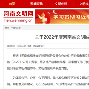 为体现公开、公正、公平原则,现将2022年度河南省文明诚信市场、文明诚信商户候选名单予以公示,听取社会各界意见,接受广大群众监督。如有意见和建议,可在公示期间工作日时间向省市场监督管理局反映。