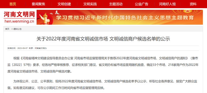 根据《河南省精神文明建设指导委员会办公室 河南省市场监督管理局关于推荐2022年度河南省文明诚信市场、文明诚信商户的通知》(豫市监〔2022〕57号)要求,经各地严格审核推荐、征求相关部门意见、省文明办和省市场监管局随机抽查,确定33个市场、218家商户作为2022年度河南省文明诚信市场、文明诚信商户候选对象。